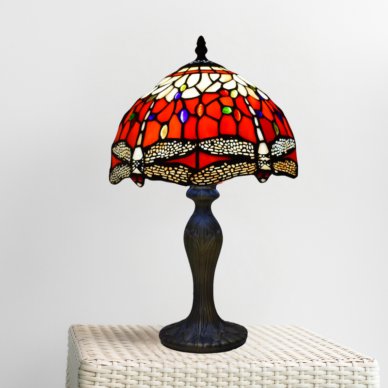 This Tiffany-style lamp serves as more than just a source of light. Made from precisely cut and arranged pieces of stained glass, it is an incredible piece of art. The detailed dragonfly motif gives the design a distinctive, organic feel that makes it stand out in any space. Glass's warm red, amber, and cream tones offer a calming, inviting glow that instantly changes the look of your room.