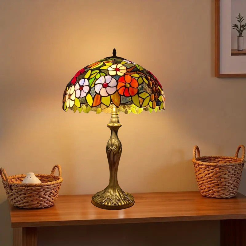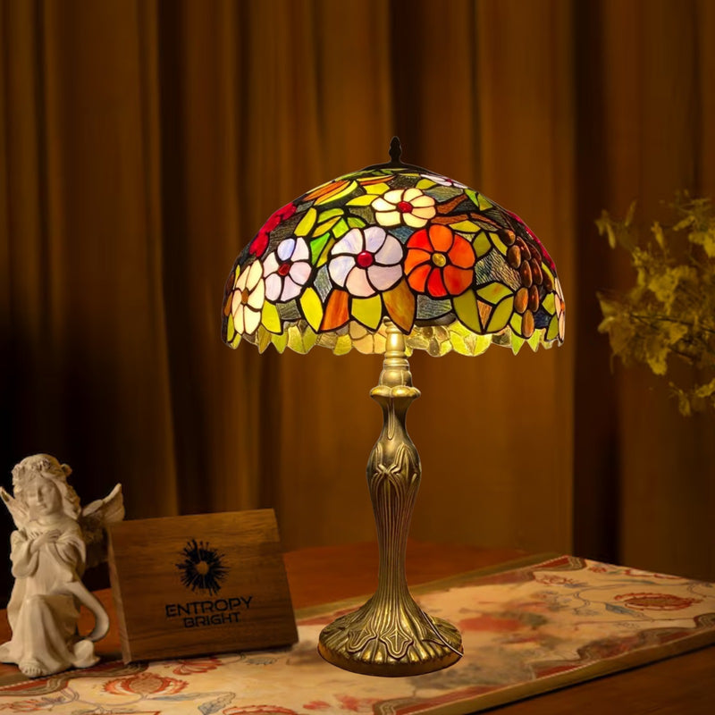 16-Inch Floral-Leafy Handcrafted Tiffany-Style Lamp features a real stained-glass dome shade filled with vibrant flowers and leafy accents and it has its roots in traditional
