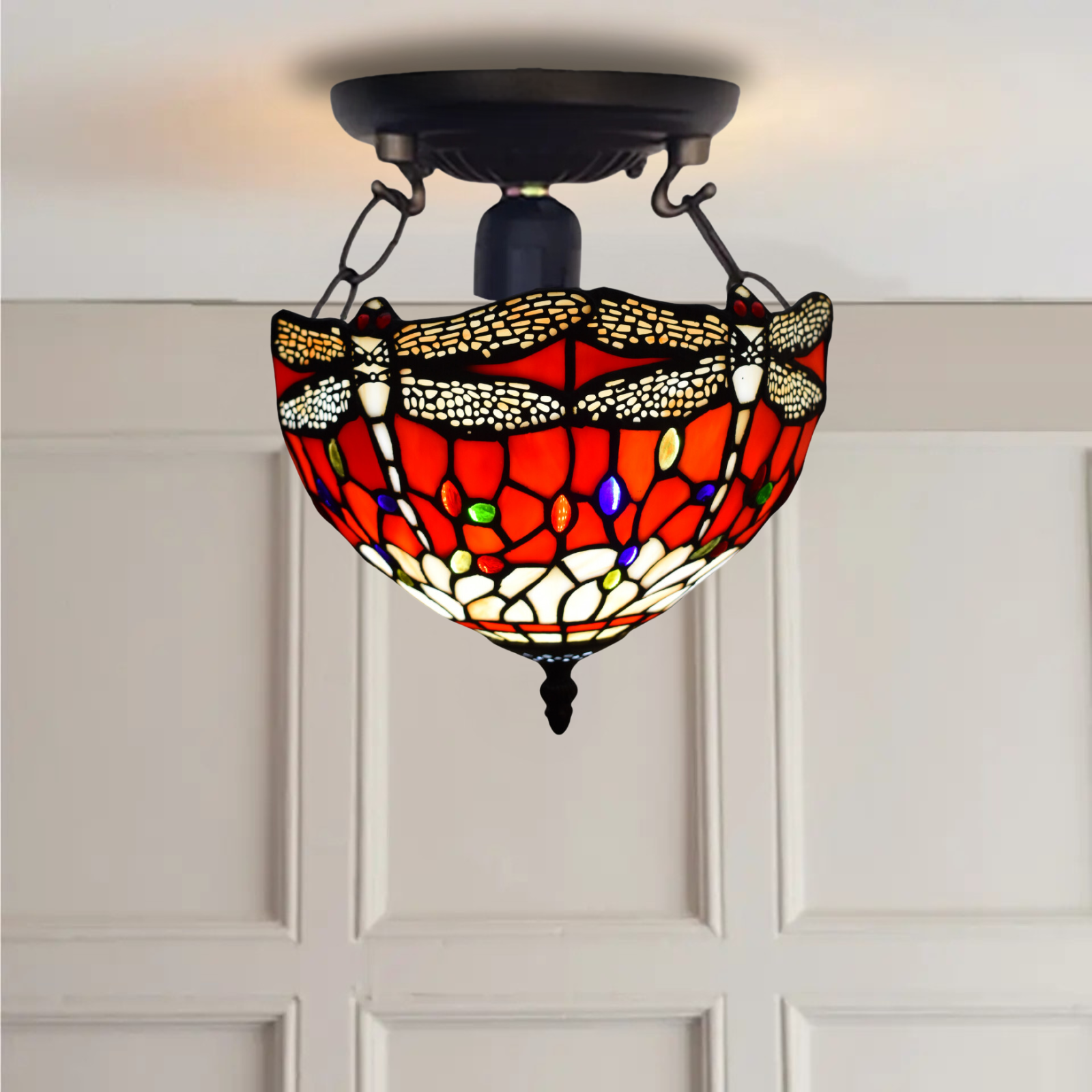 Stunning Quality Tiffany Style Stained Glass Handmade Ceiling Light 10" Wide. Light up your home with this unique Ceiling Light while adding beauty to your environment. This beautiful lamp piece contains hand-cut pieces of stained glass, each wrapped in fine copper foil. Create classic decor in your modern home with this marvelous lamp. Shade colors will appear darker and less vibrant when not illuminated. We recommend a cool tone bulb for this collection.