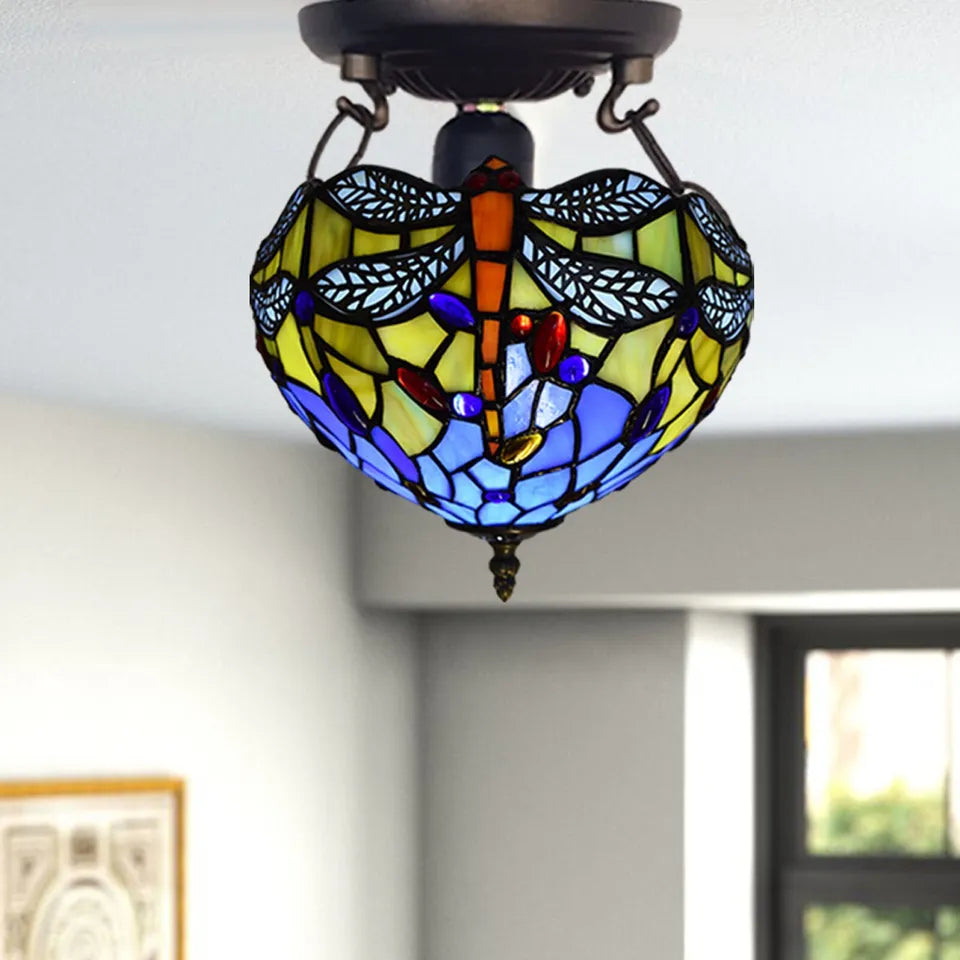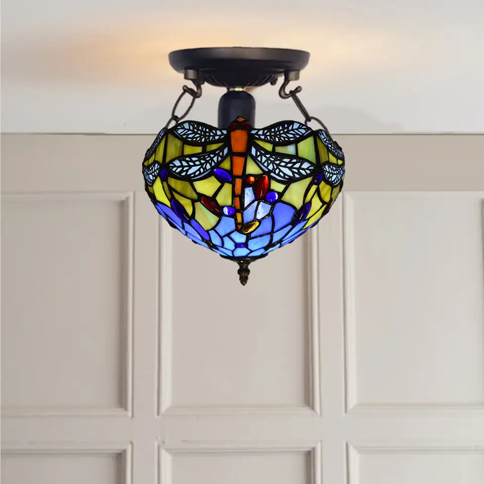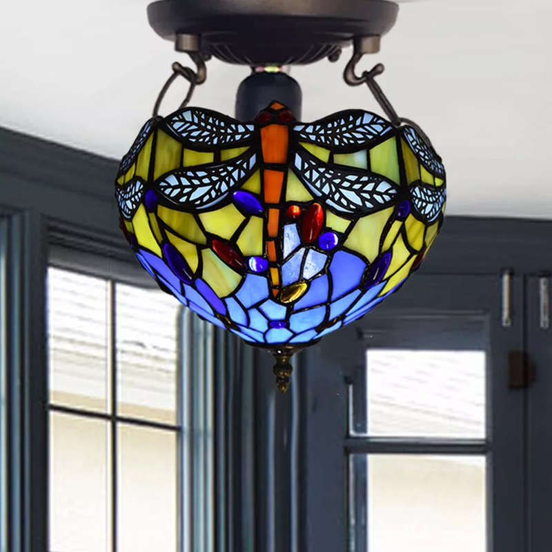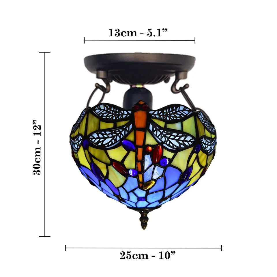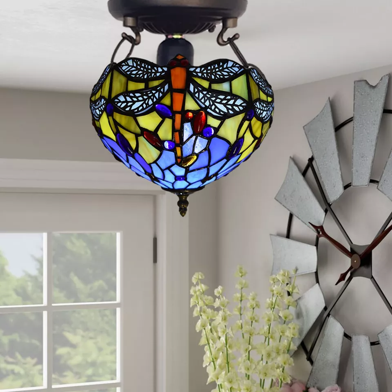 Multicolour Blue & Amber Dragonfly Tiffany-Style Ceiling Lamp is a true gem. The soldering is clean and smooth, and the glass is authentic, cool to the touch, with those minor ripples of texture. No sharp edges. No shaky parts. Just long-lasting, high-quality craftsmanship. Also, this isn't composed of plastic or resin like many mass-produced replicas are.