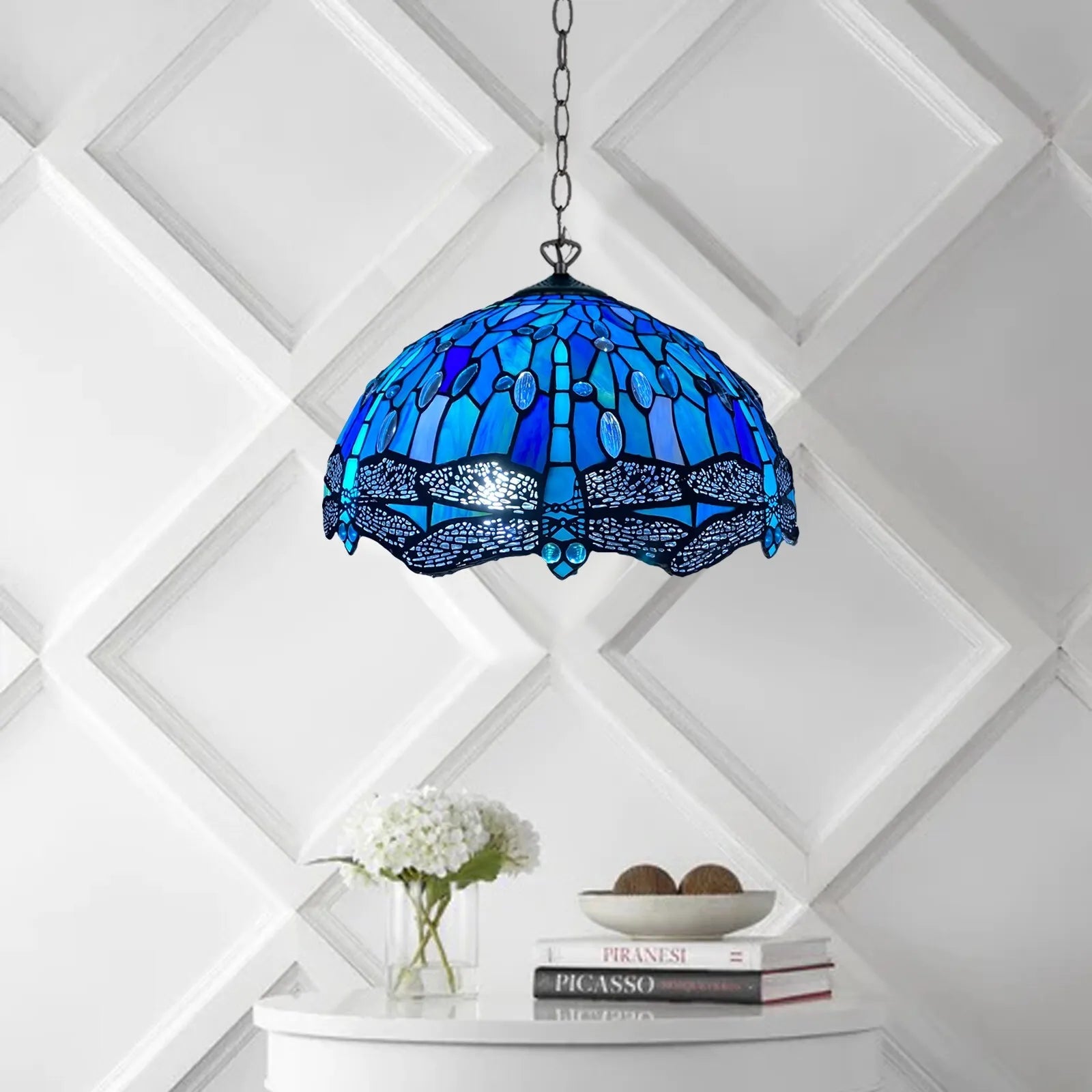 Having worked on several handcrafted Tiffany lamps throughout the years, I can assure you that 16-Inch Handmade Blue & Black Dragonfly Pendant Lamp is a true gem. The soldering is clean and smooth, and the glass is authentic, cool to the touch, with those minor ripples of texture. No sharp edges. No shaky parts. Just long-lasting, high-quality craftsmanship. Also, this isn't composed of plastic or resin like many mass-produced replicas are.