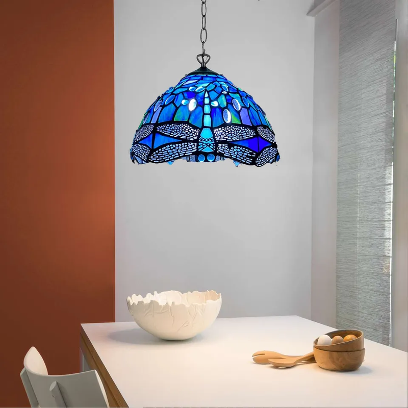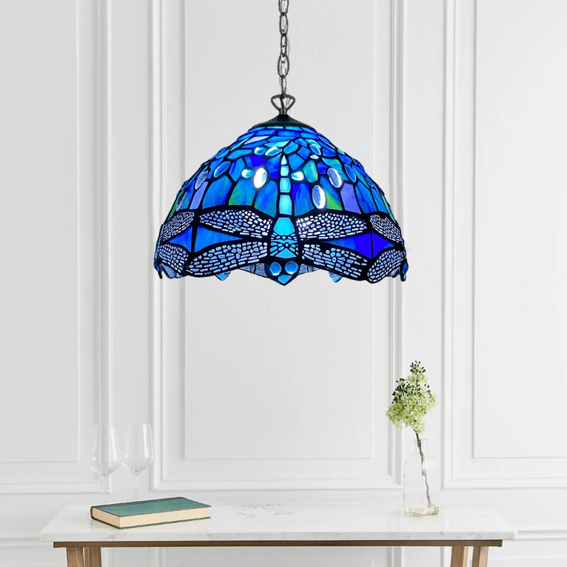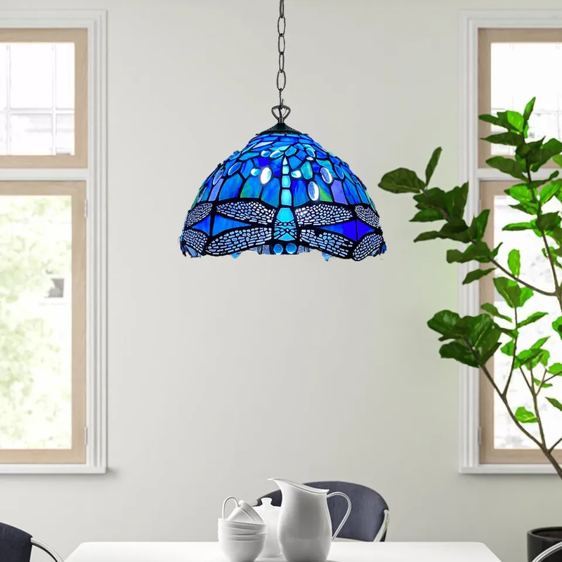 Blue & Black Dragonfly Tiffany Style Pendant Lamp 10 inch Stained Glass Shade