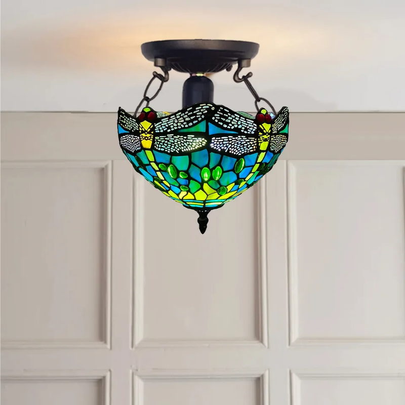 Green 10 inch Stained Glass Tiffany Dragonfly Style Ceiling Light