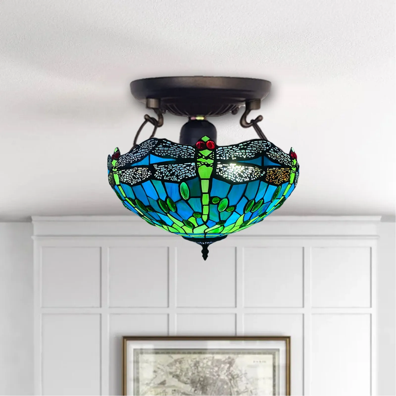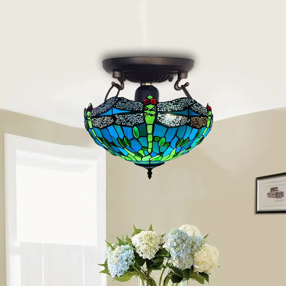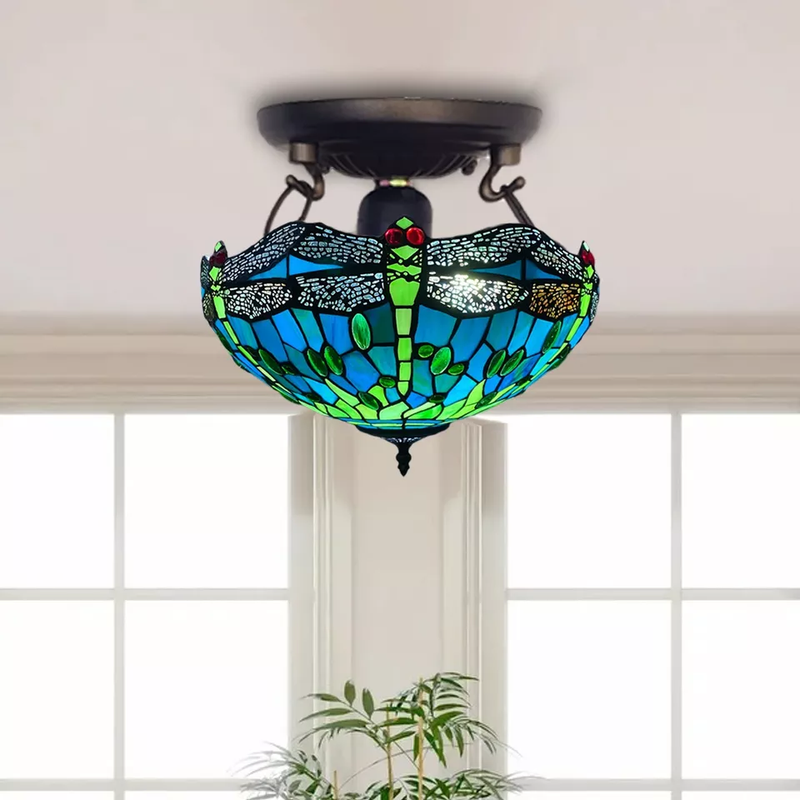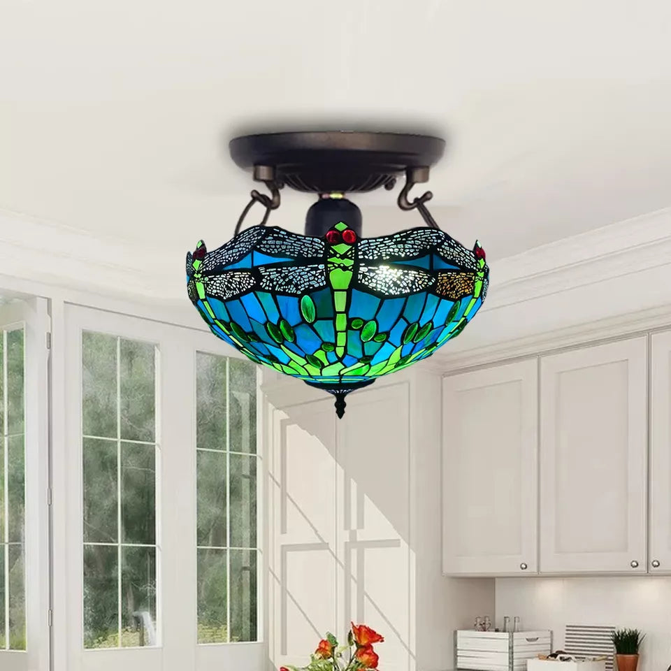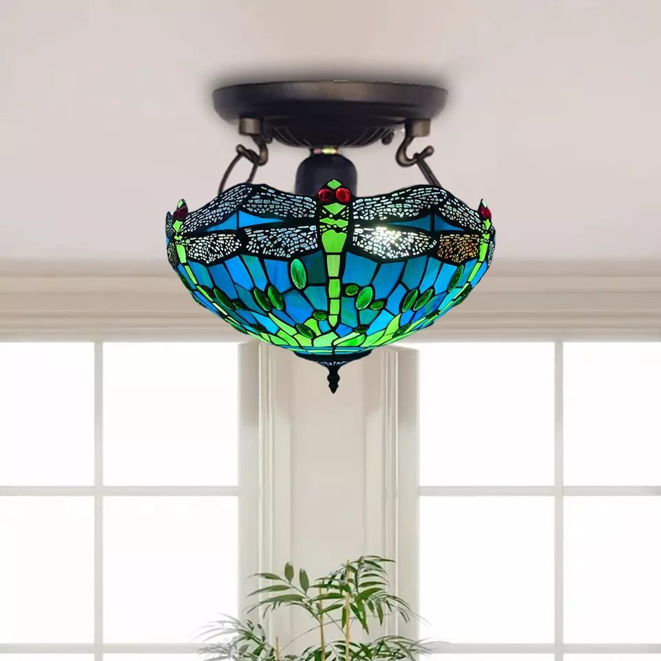 Blue & Lime Green Dragonfly Tiffany-Style Handmade Real Stained Glass Ceiling Lamp is a true gem. The soldering is clean and smooth, and the glass is authentic, cool to the touch, with those minor ripples of texture. No sharp edges. No shaky parts. Just long-lasting, high-quality craftsmanship. Also, this isn't composed of plastic or resin like many mass-produced replicas are.